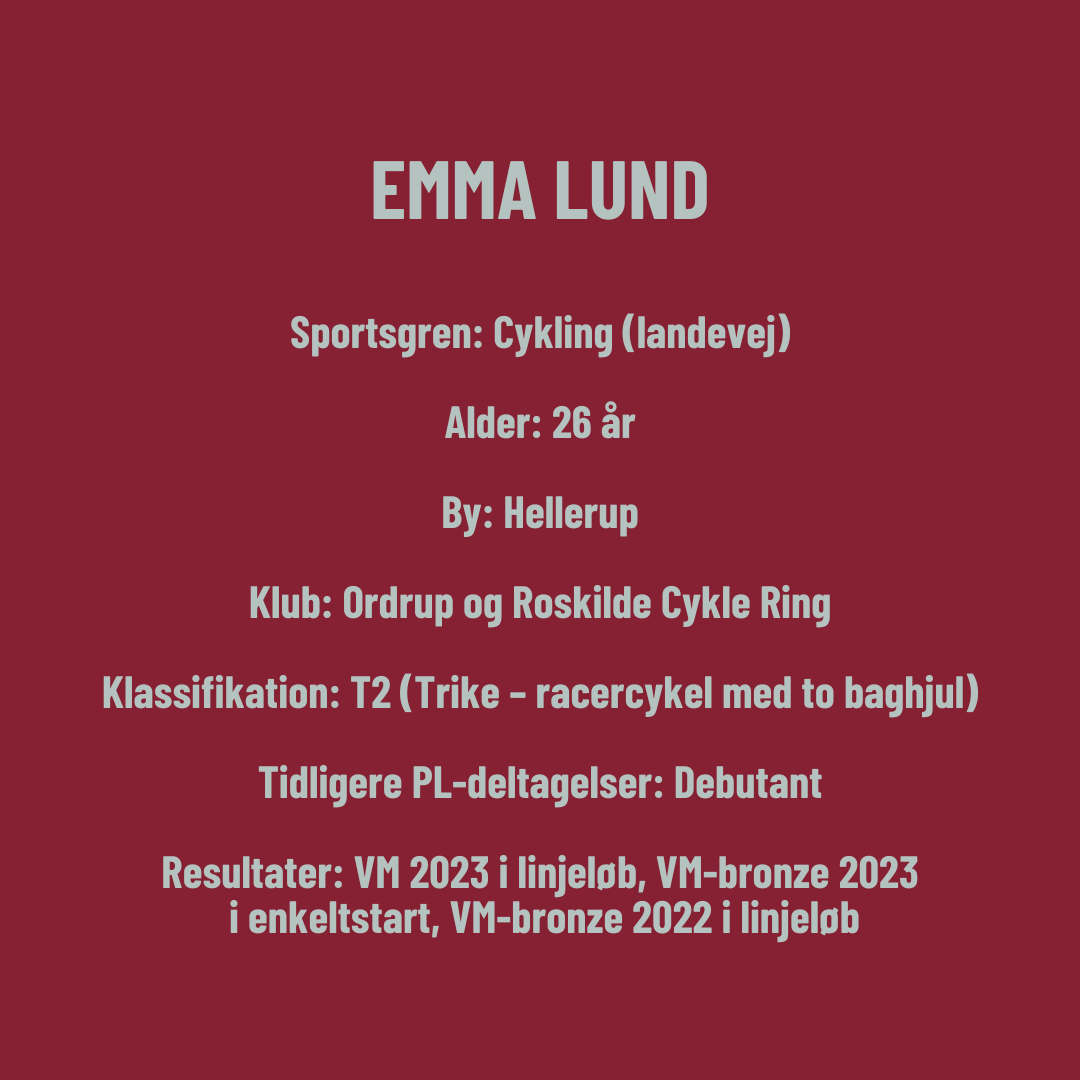 For Emma Lund har det ikke været lige ud af landevejen at nå dertil, hvor hun er i dag. I folkeskolen blev hun udelukket fra idrætstimerne, og barndoms- og ungdomsårene var præget af mobning og følelsen af ikke at passe ind. Som teenager spinnede hun flere gange om ugen, men hun havde et inderligt ønske om at træne udendørs og cykle med sin familie. Hun kontaktede Parasport Danmark, som anbefalede hende en trike (racercykel med to baghjul). På få år gik Emma fra at være motionist til elitesportsudøver, og om kort tid kan hun måske skrive historie med en dansk PL-medalje i Paris.