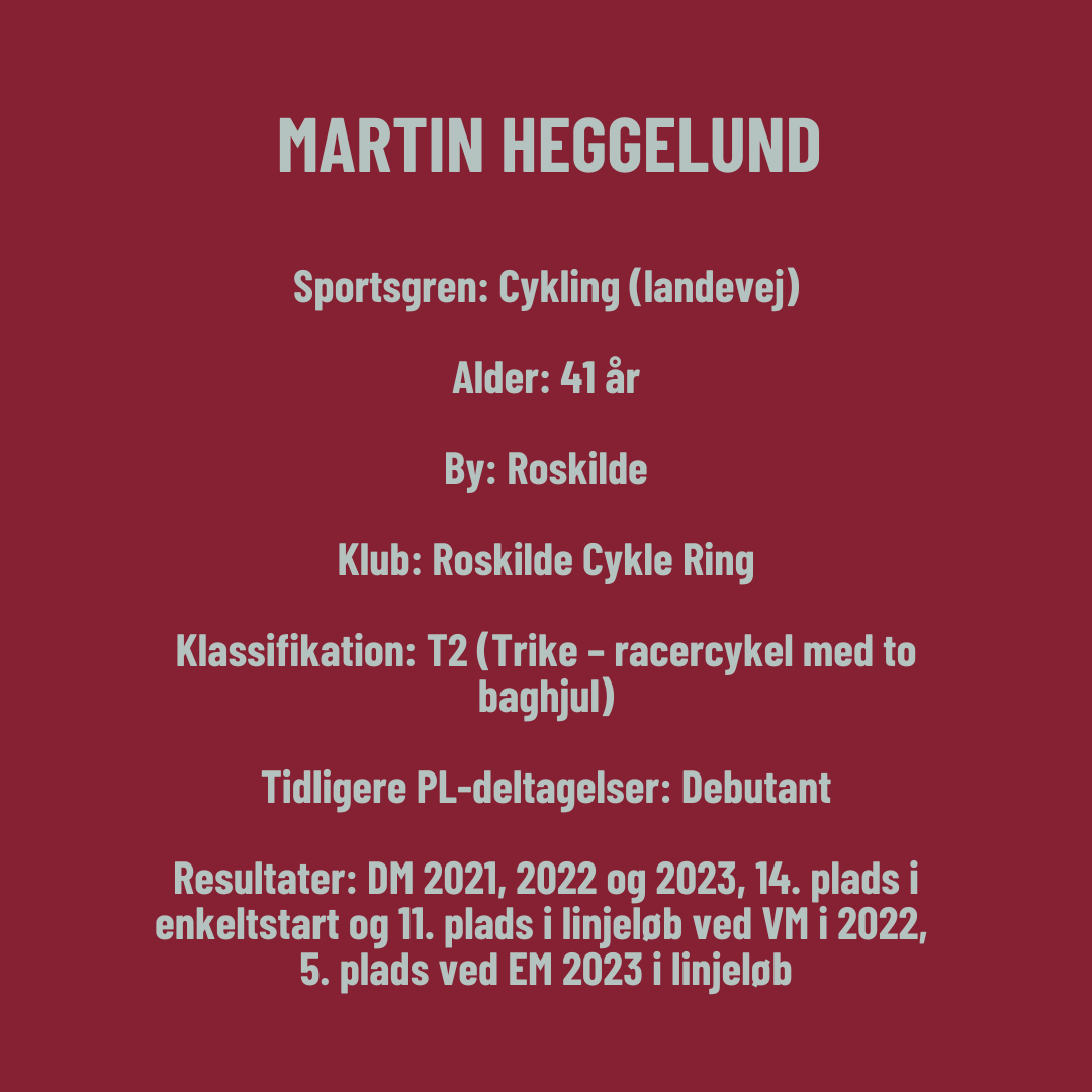 I 2018 cyklede Martin Heggelund til Paris på en tandemcykel sammen med sin far for at overvære afslutningen af Tour de France på Champs-Élysées. Nu skal han træde ind på den smukke allé i Paris igen. Denne gang som PL-deltager for Danmark, når hele den danske delegation går indmarch til åbningen af PL.